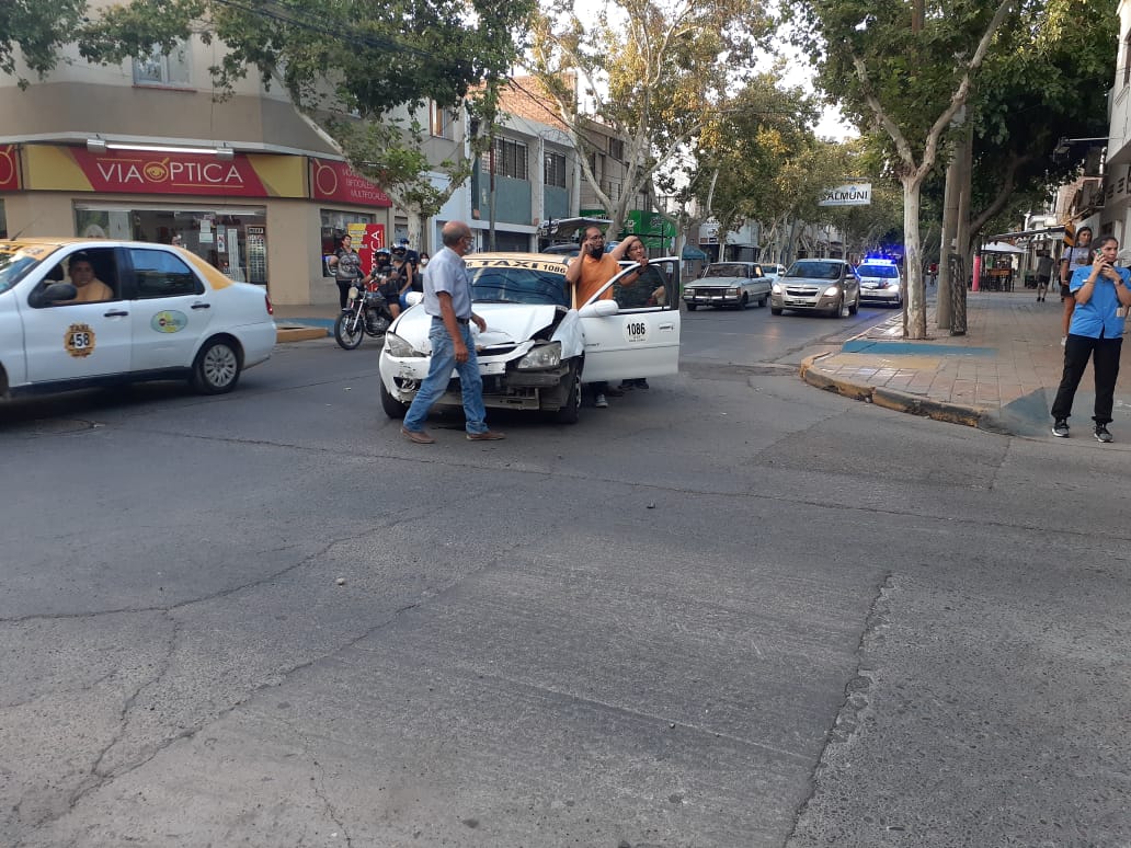 Este viernes, cerca de las 20, un aparatoso choque ocurrió en calle Mendoza y General Paz, en Capital, entre dos taxis que iban con pasajeros. No hubo heridos.