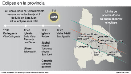 En esta ocasión, San Juan resultará privilegiada para su observación, por su ubicación geográfica, ya que el eclipse comenzará por la mañana al este de Nueva Zelanda, en el Pacífico Sur, y se irá moviendo hacia el noreste. Luego lo hará hacia el sudeste hasta tocar la costa de Chile y al atardecer en Argentina. Será visto de manera total en una faja que recorre, de oeste a este, el centro de las provincias de San Juan, sur de La Rioja, norte de San Luis, centro de Córdoba, sur de Santa Fe y norte de Buenos Aires. En nuestra provincia, donde el avistamiento ha generado una gran expectativa entre científicos y turistas provenientes de todo el mundo, tendrá en las localidades cordilleranas de Rodeo, Bella Vista y Las Flores los mejores lugares de observación, aunque también se podrá ver con similar dimensión en localidades de Jáchal, la zona del Gran San Juan, Caucete y Valle Fértil. (Ver infografía)