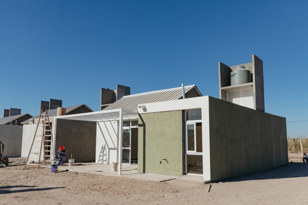 Las viviendas poseen estructura sismorresistente, con mampostería de ladrillos macizo y tabiques, revoque interior enlucido a la cal y exterior revoque grueso, salpicado planchado. Losa de hormigón armado en dormitorios, pasillo, baño y local de vivienda productiva. Techo chapa autoportante en cocina – comedor, conformada por panel con núcleo aislante de poliuretano inyectado, y accesorios necesarios para impedir filtraciones (zingueria, etc). Aislación con pomeca puzolánica, y con membrana asfáltica de aluminio. Instalación sanitaria completa. Equipamiento del baño con inodoro, bidet, lavatorio, accesorios y ventilación correspondiente. Cocina con mesada de granito natural gris mara, bacha de acero inoxidable, los apoyos de mesadas serán de caño estructural. Artefacto cocina de 4 hornallas y campana. Pileta de lavadero de losa blanca. Piso cerámico, Revestimiento cerámico en baño, lavadero y cocina.