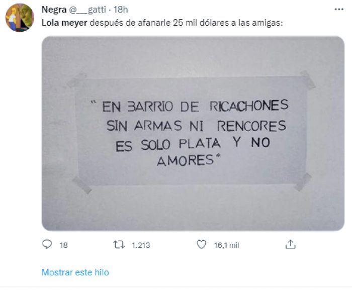 De acuerdo a lo que indicó a través de un audio que se viralizó en las redes sociales, Yanina comentó: “Desde el año pasado se dedicó a sacarle fotos a las tarjetas de crédito de sus amigas, a las madres de ellas, hermanas… iba a la casa y sacaba las tarjetas de las carteras. Abrió una cuenta de PayPal y metió todas las tarjetas”. Y advirtió que Lola “tenía como 25 tarjetas. La sumatoria de lo que estafó, hasta ahora, es de 25.000 dólares”.