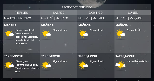 Para el fin de semana, la máxima oscilará entre los 31 y 28 grados. El lunes se prevé que la temperatura llegue a los 24ºC.