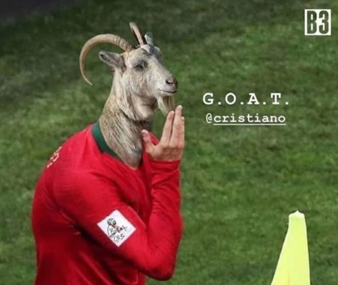 En la imagen se puede ver el cuerpo de Cristiano Ronaldo con la cabeza de una cabra, animal con el que se asocia a Lionel Messi. Es que tras una poderosa campaña en redes sociales se impuso que las siglas G.O.A.T (cabra, en inglés) significan Greatest of all times, es decir, el más grande de todos los tiempos, a partir de un hat trick convertido por el argentino ante Deportivo La Coruña, partido de la Liga de España que le permitió al Barcelona consagrarse en esa competición.