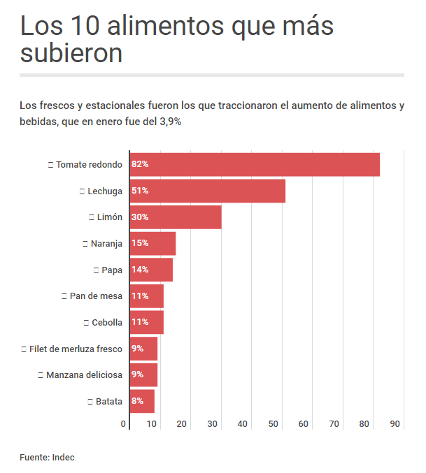 “La suba de Alimentos y bebidas no alcohólicas (4,9%) fue la de mayor incidencia en todas las regiones. Lo más relevante en la división fue el incremento de Verduras, tubérculos y legumbres, donde se destacaron el tomate, la lechuga, la papa y la cebolla, entre otras. También sobresalió dentro de la división el alza de Frutas, especialmente el limón y la naranja”, detalló el Instituto Nacional de Estadística y Censos en su informe de inflación de enero.