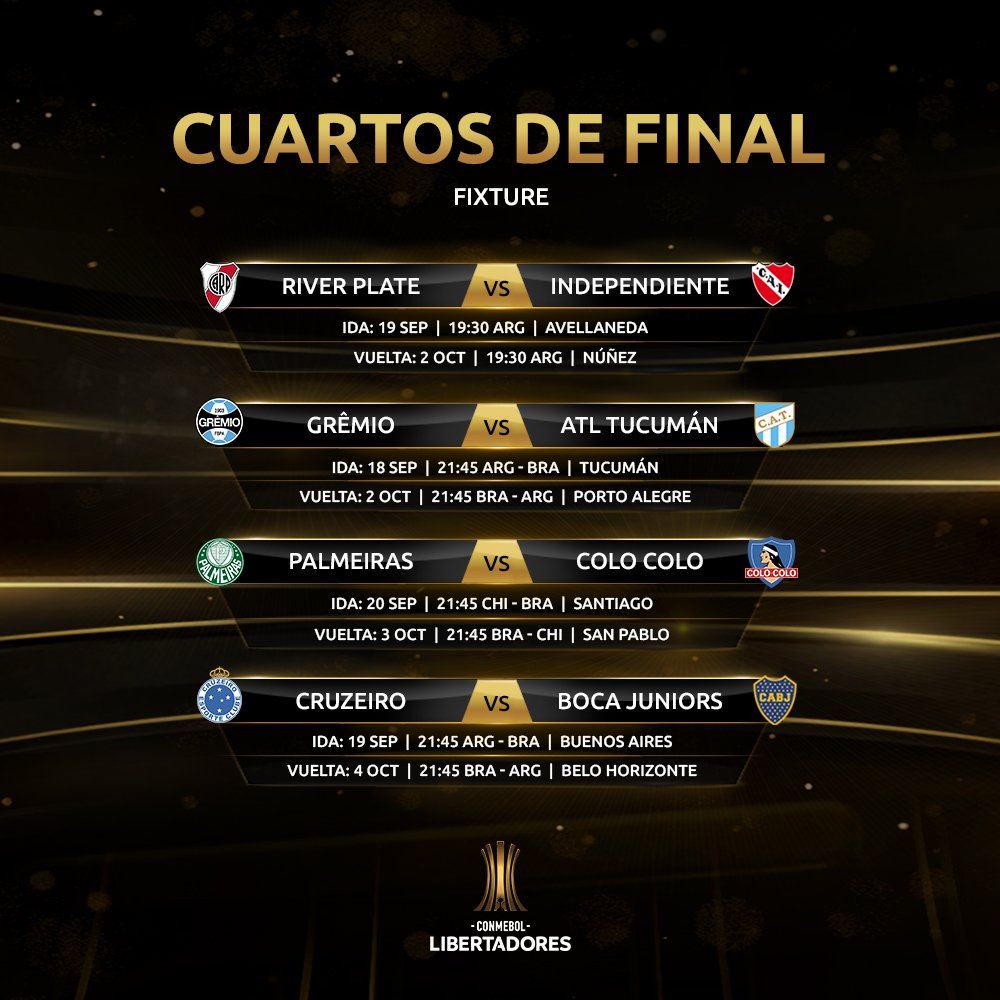 El equipo del norte del país abrirá la llave el próximo 18 de septiembre en el Estadio José Fierro (19.30). Al día siguiente, Buenos Aires vivirá una jornada plena de fútbol con el partido entre el Rojo y el Millonario en Avellaneda (19.30) y luego el Xeneize hará lo mismo frente a los de Belo Horizonte (21.45) en La Bombonera.