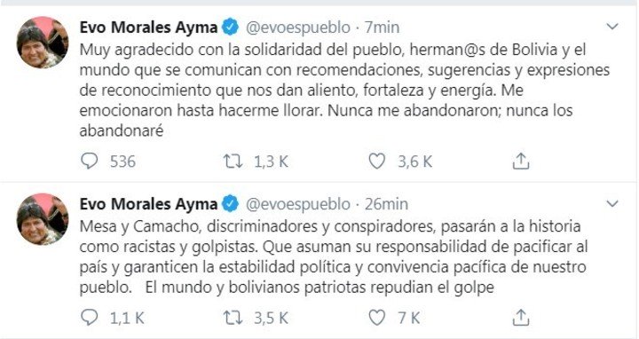 "Mesa y Camacho, discriminadores y conspiradores, pasarán a la historia como racistas y golpistas. Que asuman su responsabilidad de pacificar al país y garanticen la estabilidad política y convivencia pacífica de nuestro pueblo. El mundo y bolivianos patriotas repudian el golpe", escribió Evo en su cuenta de Twitter.