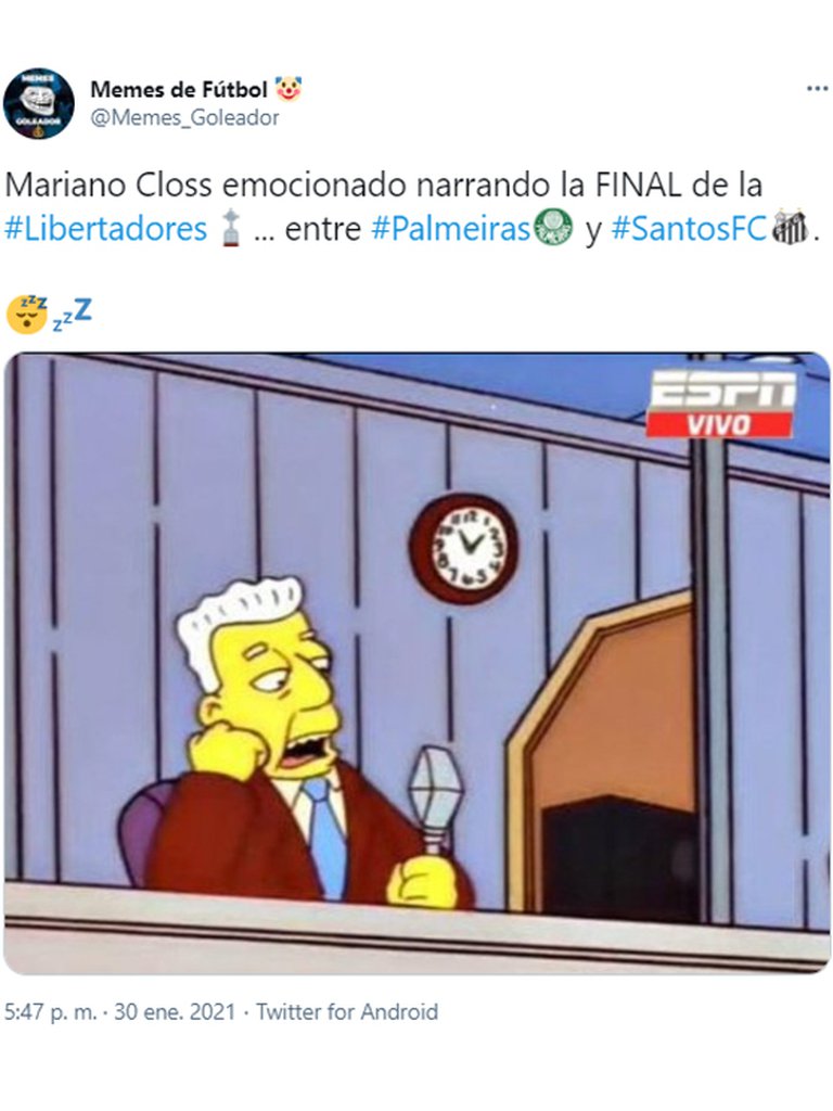 El Estadio Maracaná fue testigo de una final discreta de la Copa Libertadores: Palmeiras venció 1-0 al Santos con un gol a los 98 minutos de juego y se llevó el título, pero todas las miradas quedaron centradas en la escasa acción que tuvo el partido. Las redes sociales explotaron ante el soporífero trámite de juego y hicieron saber su descontento con los clásicos memes.
