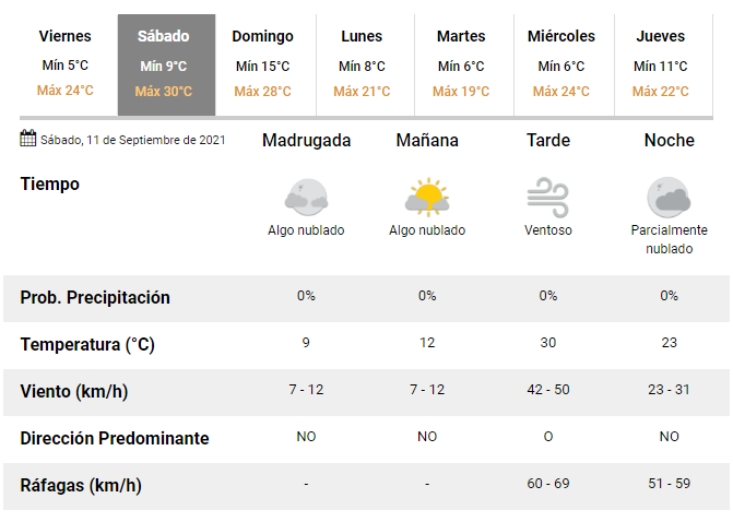 El viento del oeste alcanzará velocidades entre 60 y 69 kilómetros por hora el sábado en la tarde e irá bajando a 51-59 km/h, en la noche. El cielo estará parcialmente nublado y la máxima de la jornada trepará hasta los 30°C.
