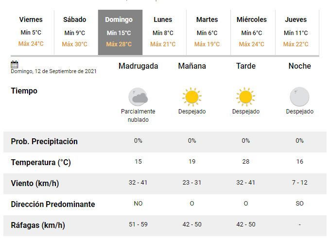 Para el domingo, el Servicio Meteorológico Nacional actualizó los datos y extendió el alerta de viento Zonda, ya que durante el día el viento oscilará entre los 42 y 50 km/h.