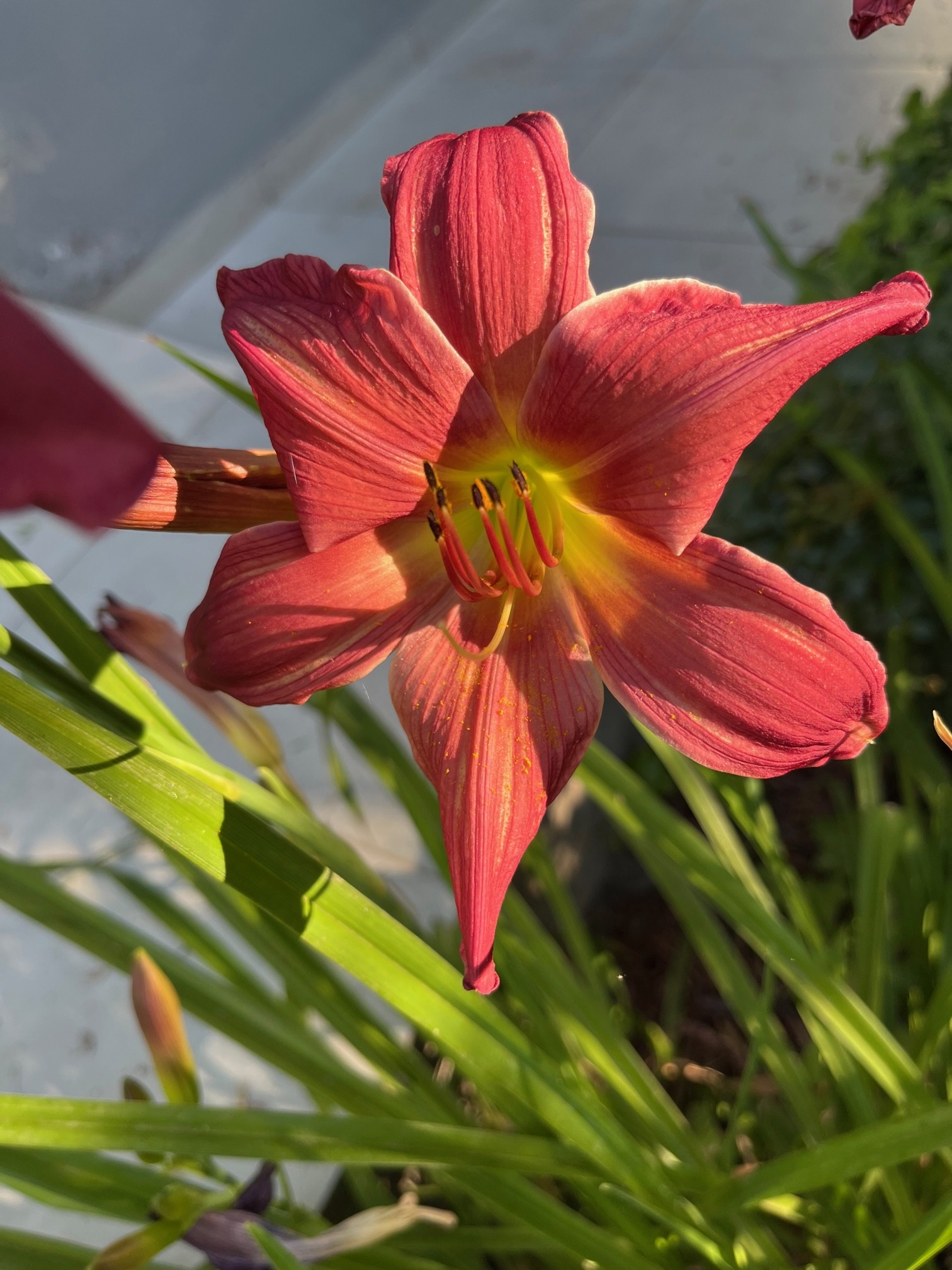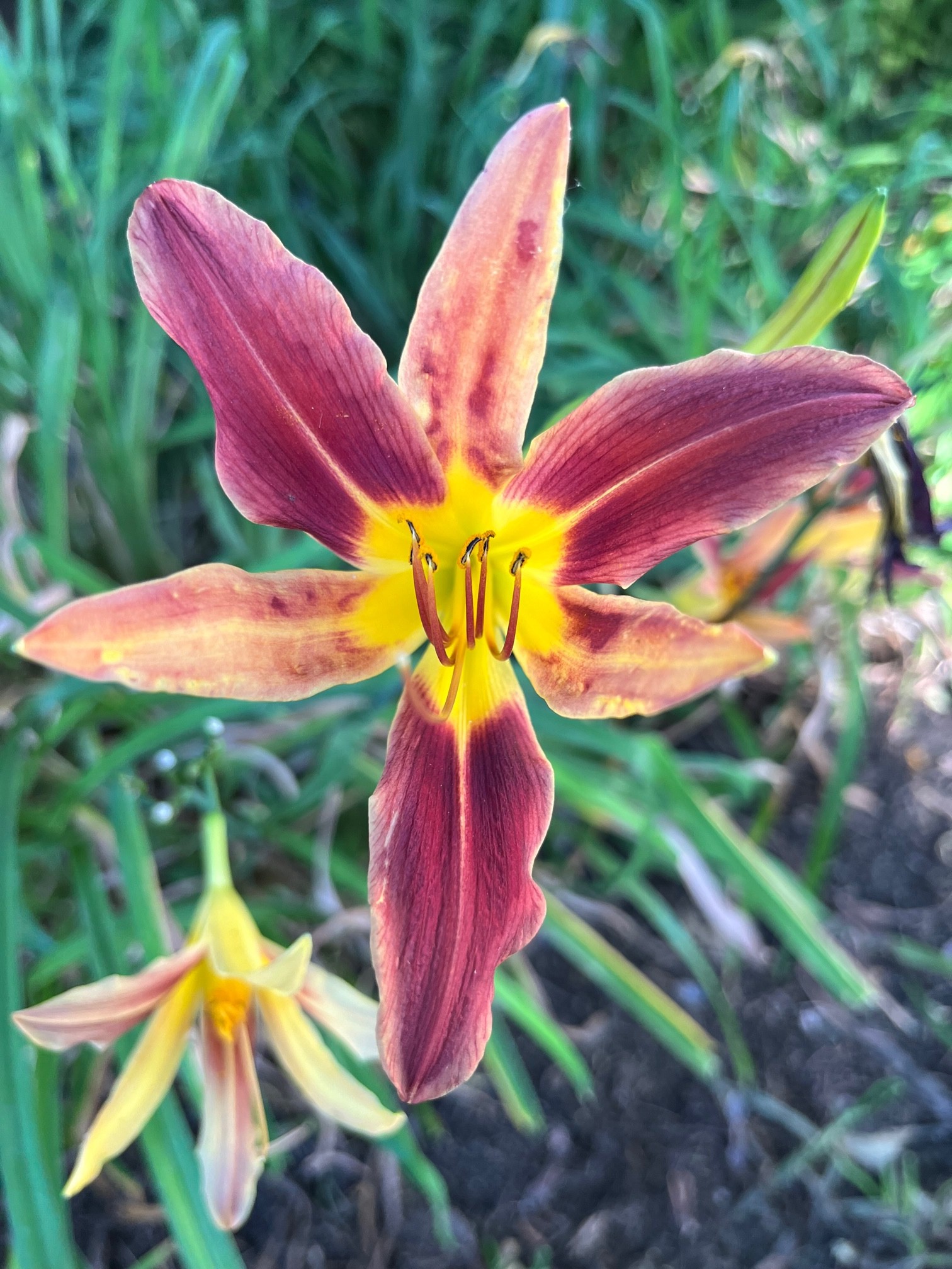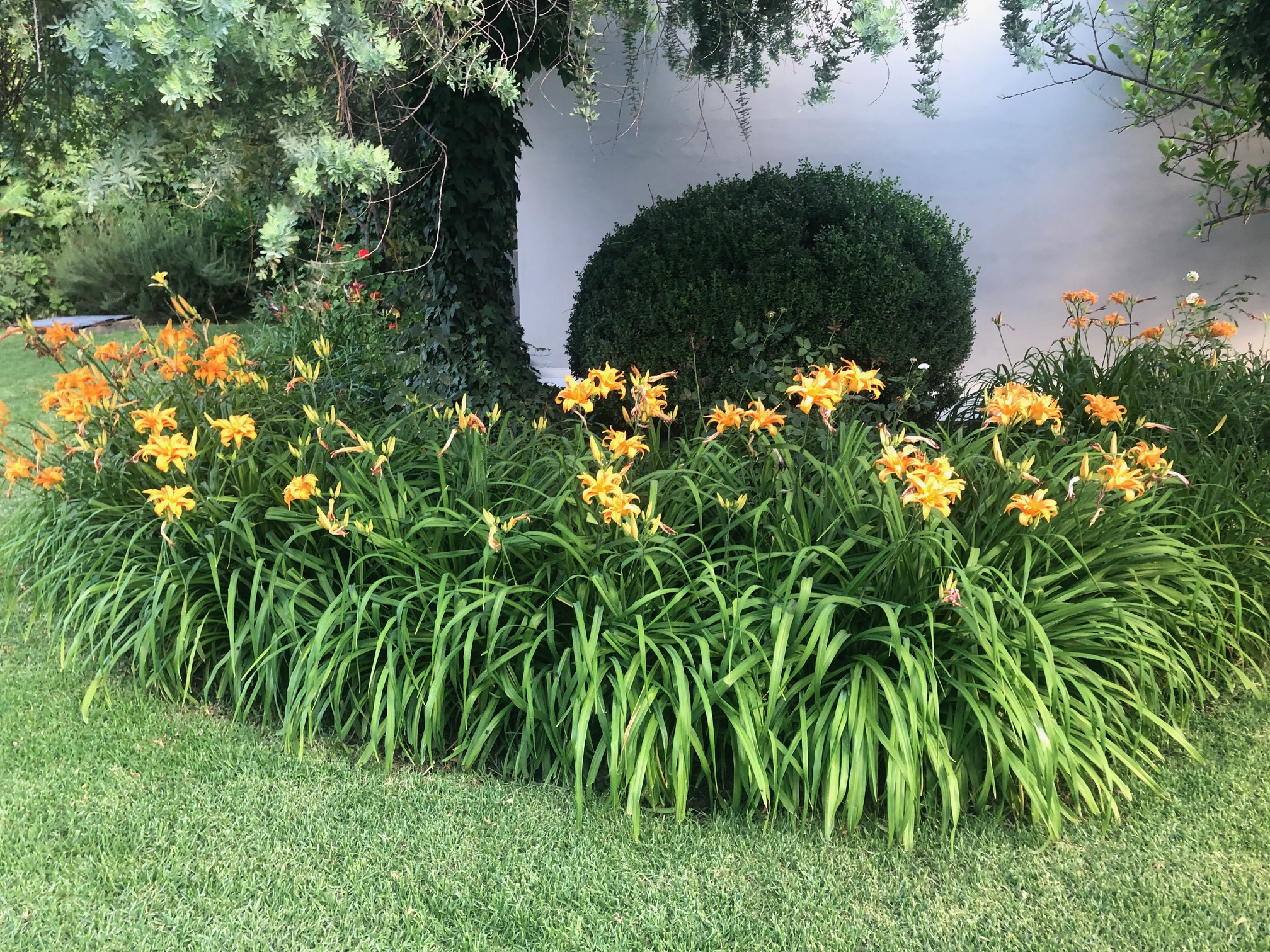 Es una planta excelente para aquellas personas que todavía no saben regar bien y se exceden con el agua. Durante el verano requieren de mucha hidratación, pero también llevan bien algunos períodos de sequía. Esta planta se adapta y se recupera bien. Parecen trompetas amarillas, en este caso alternando con grana, sus flores son tan llamativas como efímeras. Se la conoce como la azucena turca, azucena amarilla o lirio de San Juan "Hemerocallis spp" es su nombre científico. Al atardecer desecha una flor, sustituyéndolas por otras nuevas; como quien cambia cada día las flores de su cuidado jarrón. No en vano se la conoce también como lirio de día, flor de un día o lirio de la mañana. Escaso apego es el que tiene por sus flores en pos de ofrecerte siempre lo mejor. Cada amanecer, durante la floración, aquellas marchitas serán sustituidas de manera constante.