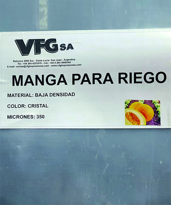 Mencionó Fuentes, mientras recorríamos la planta ubicada en Santa Lucía, "hacemos todo tipo de bolsas, es muy vendida la de verduras, también pasas, pistachos, uvas, cerezas, peras, etc. Los mulching, o cobertores plásticos, de 25 a 30 micrones, se demandan desde el sector tomatero para industria, también para melones, sandías y otros cultivos, los hacemos con perforaciones a medidas".
