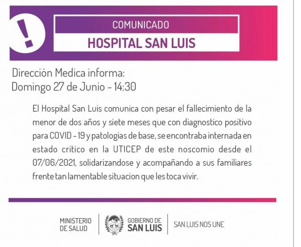 A través de un comunicado, el Ministerio de Salud de la provincia de San Luis informó el fallecimiento de la nena de 2 años y 7 meses, este domingo a las 14:30. La menor, que tenía patologías de base, fue diagnosticada con Covid-19 el pasado 7 de junio, y desde entonces estaba internada en grave estado.