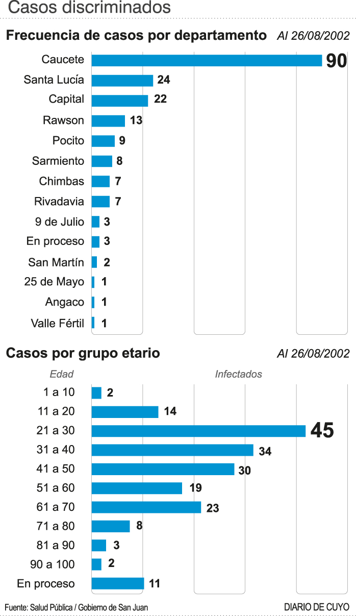 De acuerdo a las estadísticas que dio a conocer el Ministerio de Salud Pública, en 13 de los 19 departamentos hubo al menos un caso de coronavirus. Caucete (hasta el 26 de agosto) es el que más positivos acumula, con 90; mientras que lo escoltan Santa Lucía, con 24, y Capital, con 22.