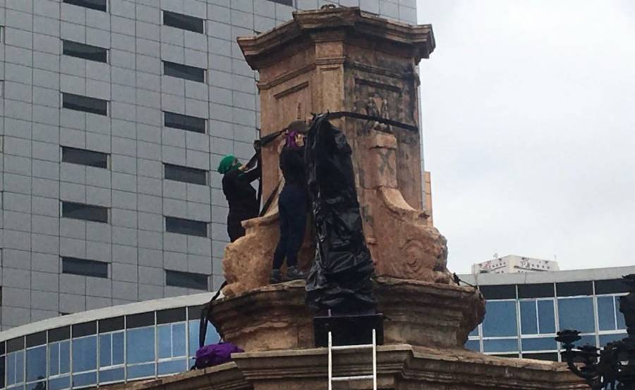 Mujeres encapuchadas escalaron por el pedestal, ubicado en una rotonda del céntrico Paseo de la Reforma, para instalar y desvelar la figura de una mujer con el puño en alto.