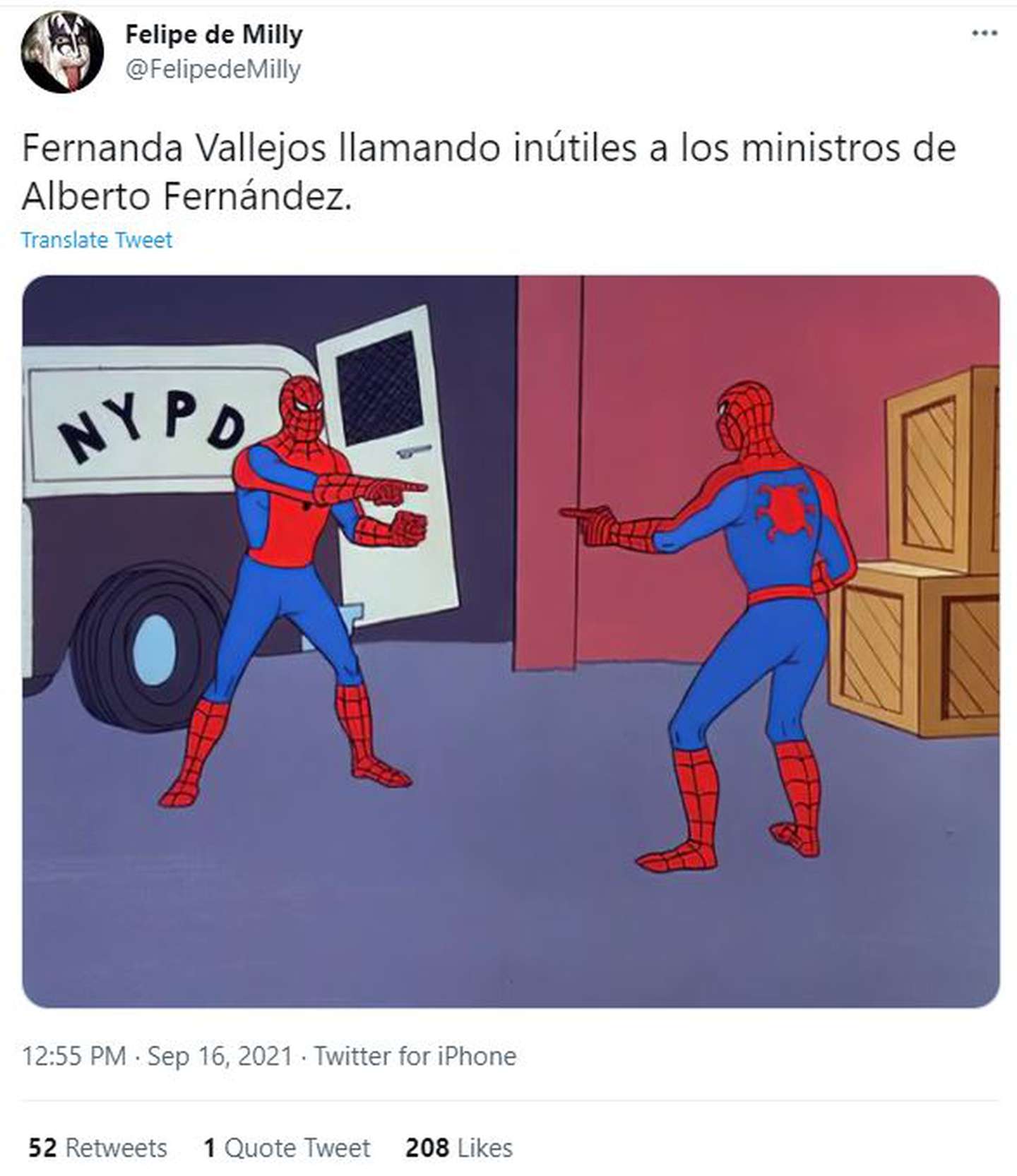 Un infaltable de los memes en las redes, el Spider-Man señalando a otro Spider-Man, o en este caso, según Felipe de Milly, “Vallejos llamando inútiles a los ministros de Alberto Fernández”.