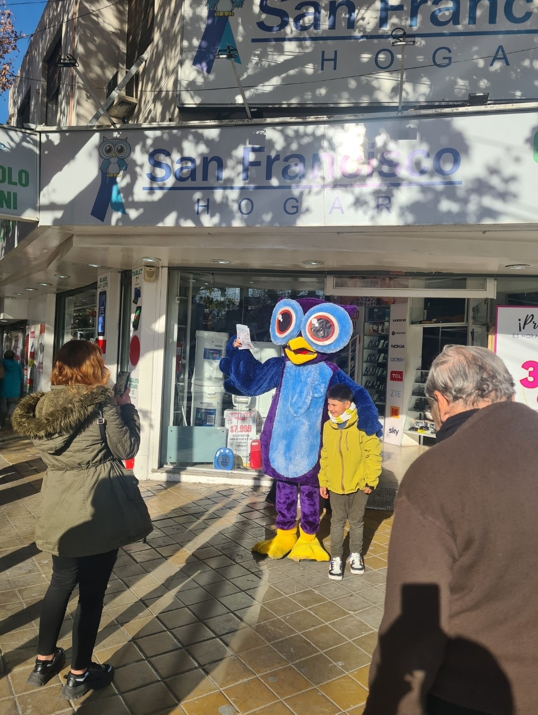 CREDITO SOLO CON TU DNI, es el lema de la casa y así recorre las calles sanjuaninas con su mascota, un búho con ojos grandes que llama la atención de niños, adolescentes y grandes.