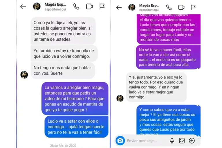 En otro chat, Christian le dice a Valenti: “Magui vos firmaste papeles. El día que quieras a Lucio tenés que cumplir con las condiciones. Un trabajo estable, un hogar para Lucio y un montón de cosas más. No te va a ser fácil. Ellos [por los tíos] no te lo van a dar así como si nada. El nene no es un paquete para tenerlo de acá para allá”. A lo que ella le aseguró: “Justamente, ya los tengo a todos. Por eso, quiero que vuelva conmigo. Y en ningún lugar va a estar mejor que conmigo”.