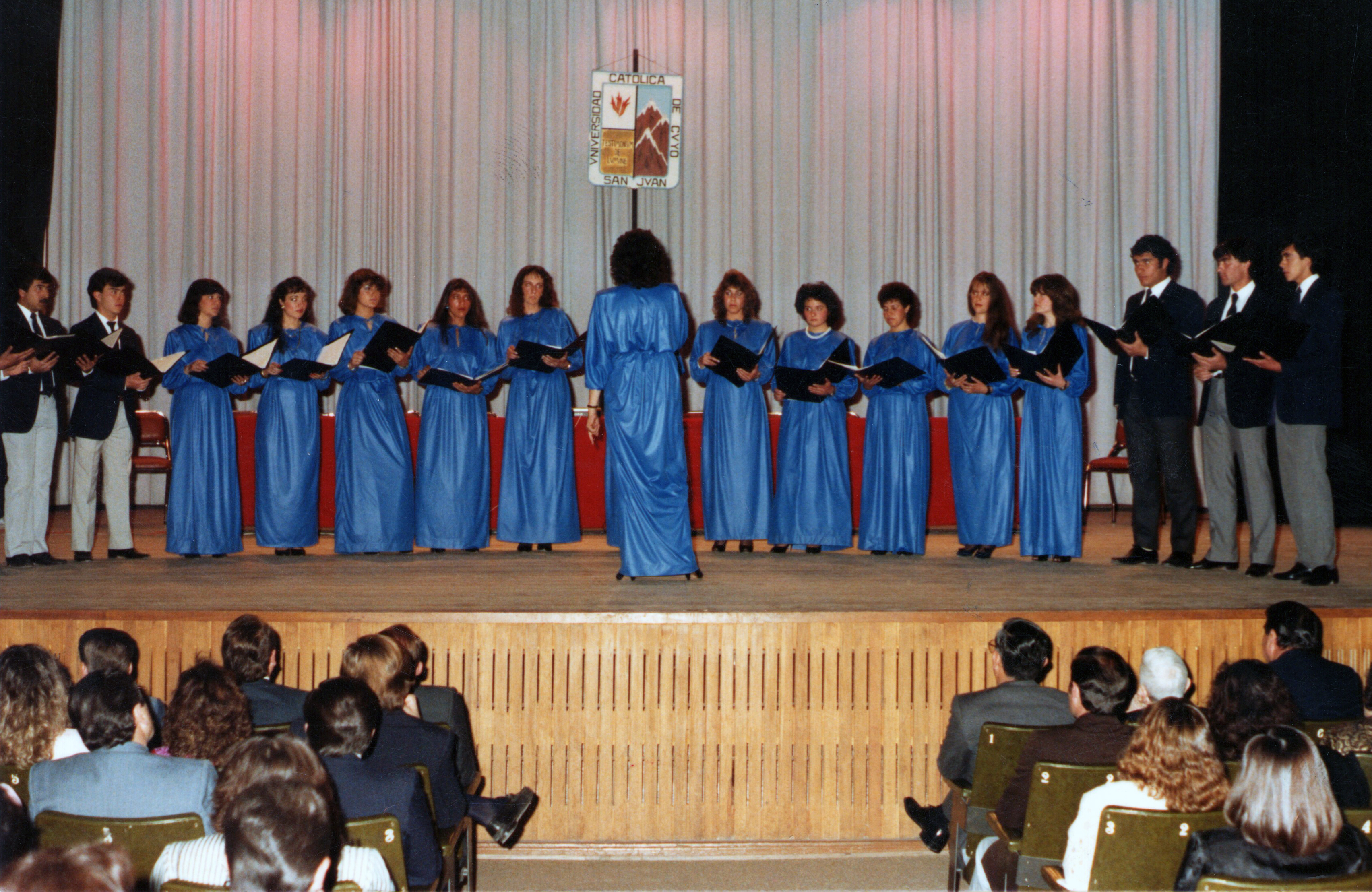 Primera actuación oficial del coro, en 1986, en la colación de grado de la Universidad Católica de Cuyo.