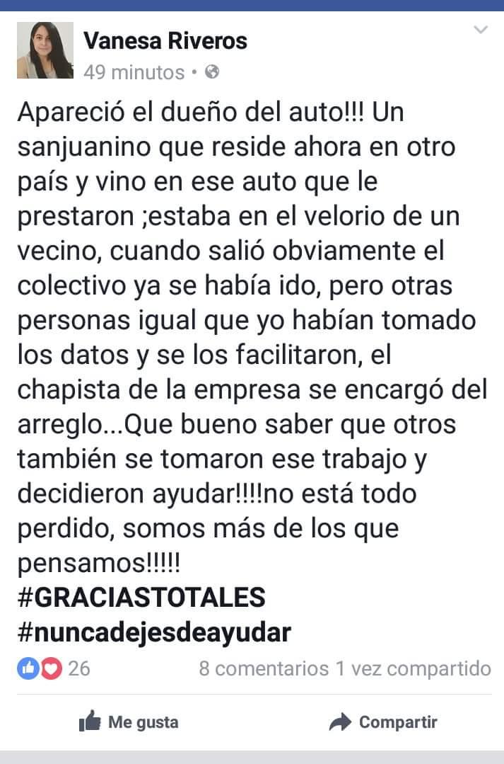 Su publicación se viralizó y llegó a quien debía llegar: el propietario del rodado. Se trata de un sanjuanino que reside en otro país y que al momento del impacto estaba en el velorio de un vecino. Para peor, el auto no es suyo, sino que se lo prestaron.