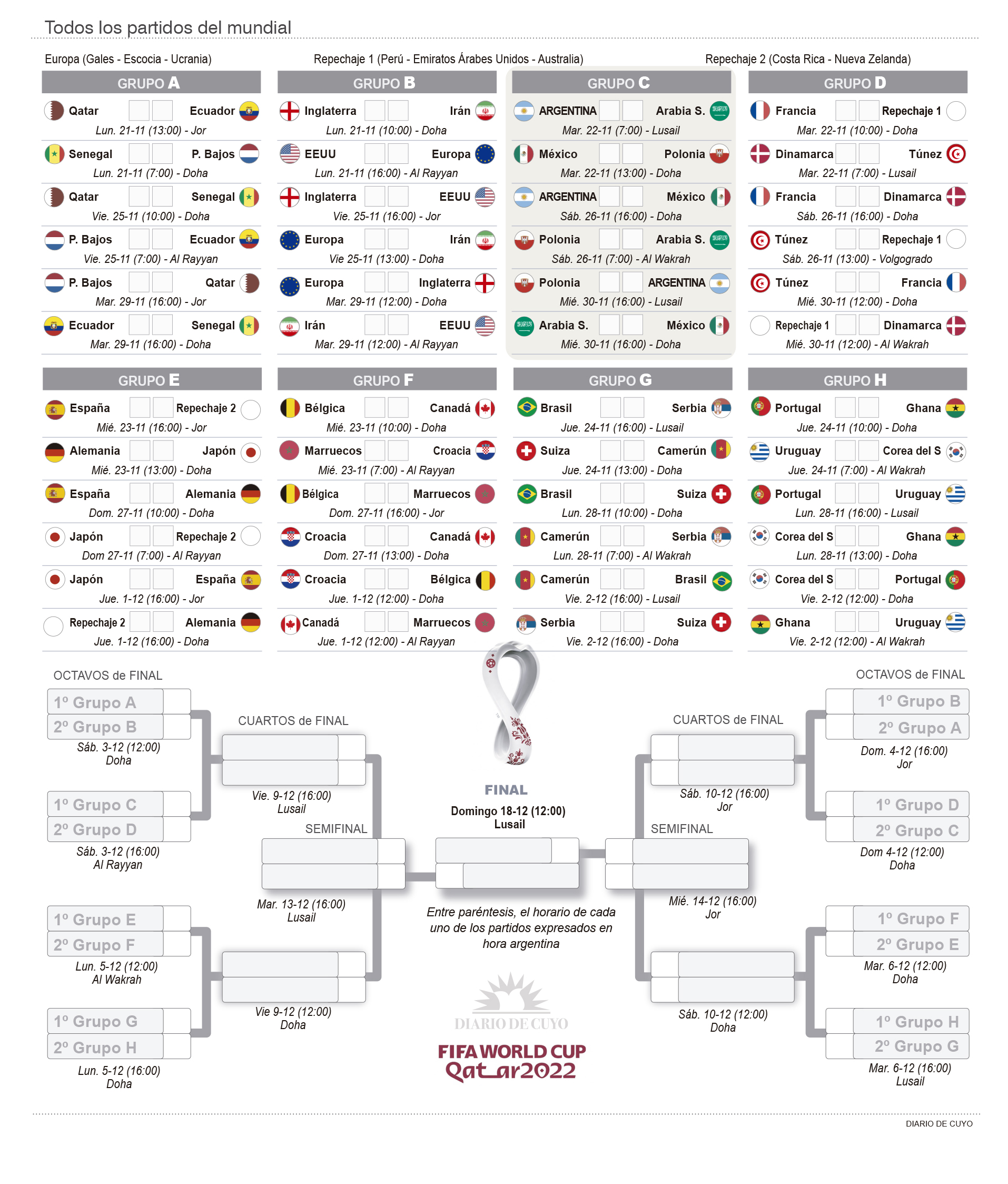 Diario de Cuyo | HOME | Noticias | Mundial de Qatar 2022 FIXTURE DEL MUNDIAL QATAR 2022 Por Redacción Diario de Cuyo 01/04/2022 · 0:00 Escuchar la noticia Escuchar la noticia Your browser doesn’t support HTML5 audio Mundial de Qatar 2022 Ver los comentarios ›