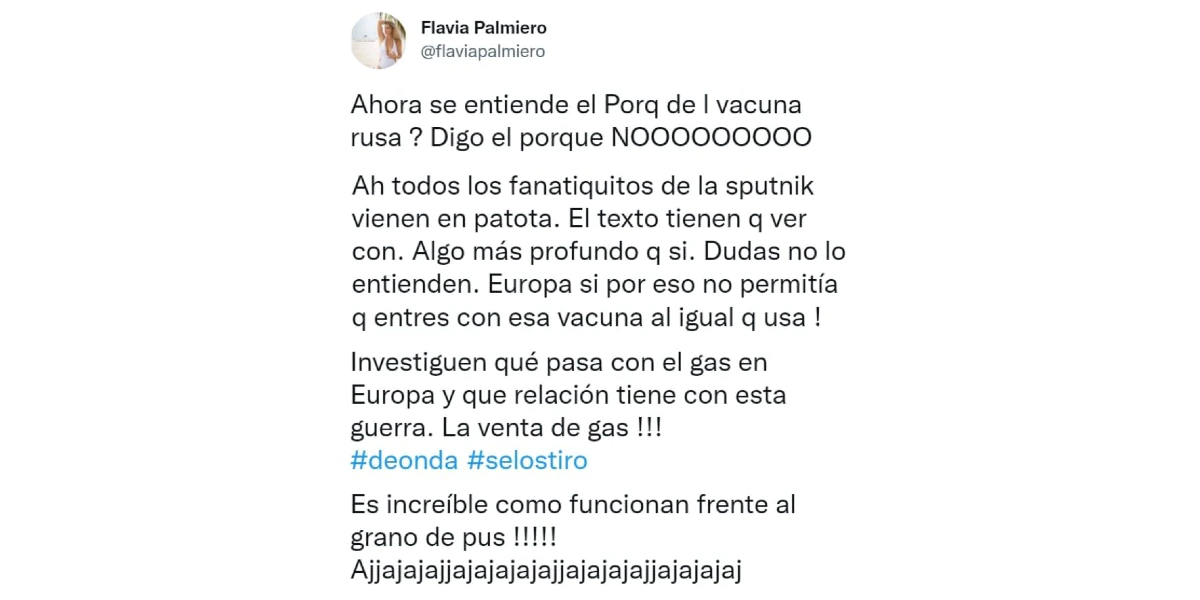 “Investiguen qué pasa con el gas en Europa y qué relación tiene con esta guerra. La venta de gas!! Es increíble cómo funcionan frente al grano de pus!!!! jajajajaja”, concluye su opinión. El tuit recibió todo tipo de comentarios negativo y críticas, lo que la llevó a borrarlo.