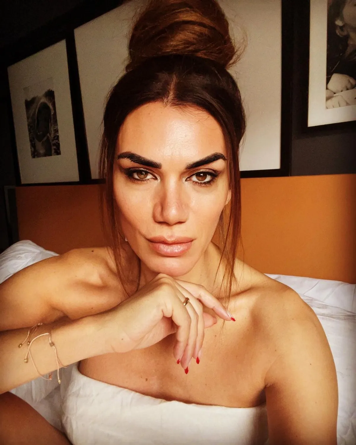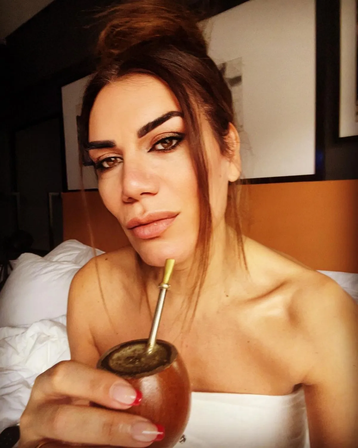 Aprovechando su rato libre durante el fin de semana, Florencia se fotografió desde su cama con poco maquillaje , un rodete y cubriéndose con una sábana.
