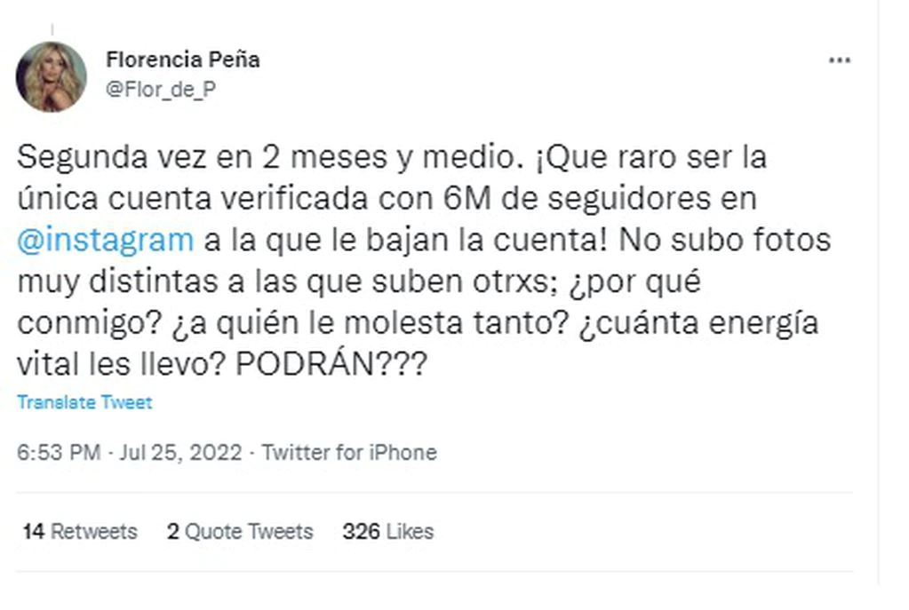 “Segunda vez en 2 meses y medio. ¡Que raro ser la única cuenta verificada con seis millones de seguidores en Instagram a la que le bajan la cuenta!”, sumó y no pudo evitar expresar su rabia: “No subo fotos muy distintas a las que suben otrxs; ¿Por qué conmigo? ¿A quién le molesta tanto? ¿Cuánta energía vital les llevó? PODRÁN???”.