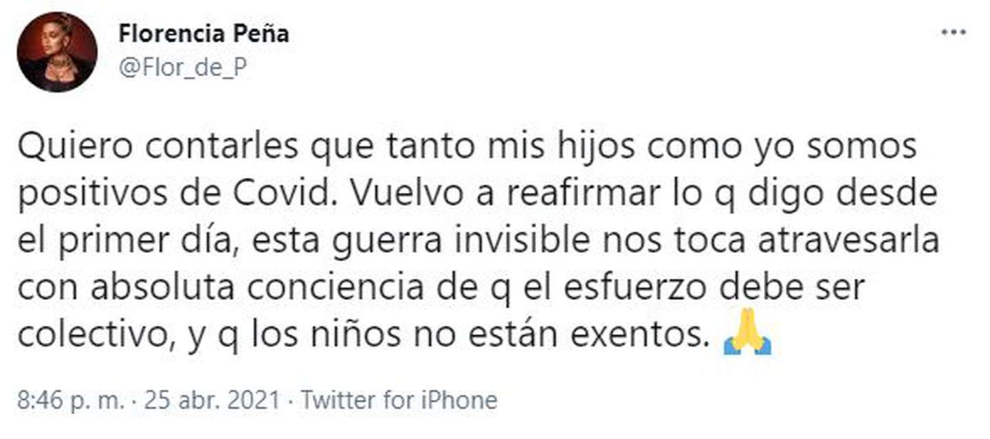 La actriz y conductora Florencia Peña contó este domingo a través de Twitter que ella y sus tres hijos dieron positivo en coronavirus. “Vuelvo a reafirmar lo que digo desde el primer día. Esta guerra invisible nos toca atravesarla con absoluta consciencia de que el esfuerzo debe ser colectivo”, escribió en esa red social, donde tiene más de dos millones y medio de seguidores.