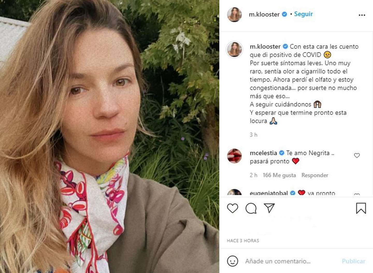 Este domingo, además, otra famosa contó que se contagió coronavirus. Fue la actriz Marcela Kloosterboer, quien a través de Instagram dijo que tuvo “síntomas leves” y remarcó que uno de ellos fue “muy raro”. “Sentía olor a cigarrillo todo el tiempo”, aseguró. “Ahora perdí el olfato y estoy congestionada… por suerte no mucho más que eso”, manifestó y pidió continuar con los cuidados en medio de la segunda ola de la enfermedad.