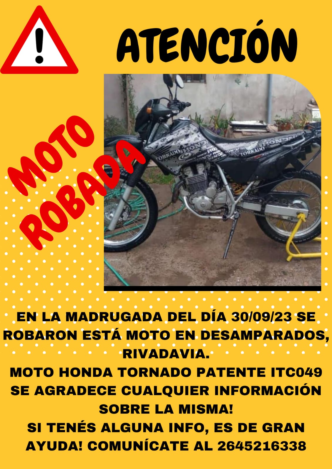 Según las fuentes, el hecho ocurrió en Desamparados, Rivadavia, alrededor de las 4 y cuando el dueño se levantó, la moto Honda Tornado ya no estaba.