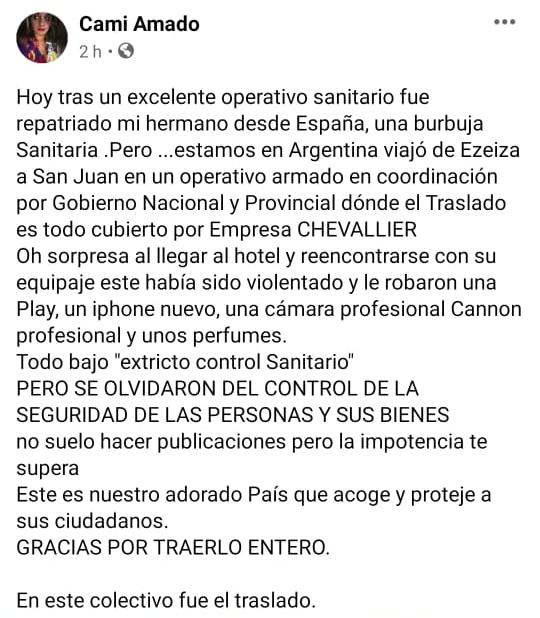 "En el aeropuerto de Ezeiza esperó como dos horas, hasta ahí él tenía la valija y estaba todo bien, y ahí lo subieron al colectivo de repatriados", contó su hermana Camila.
