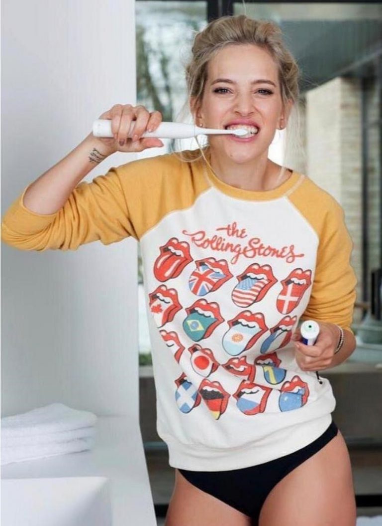 “Cepilla tus dientes arriba y abajo. Cepilla tus dientes girando y girando. Cepilla tus dientes de izquierda a derecha…”, escribió en inglés Luisana junto a tres fotos en las que se la ve divina, lavando sus dientes casi sin maquillaje, en bombacha y con un buzo de los Rolling Stones.