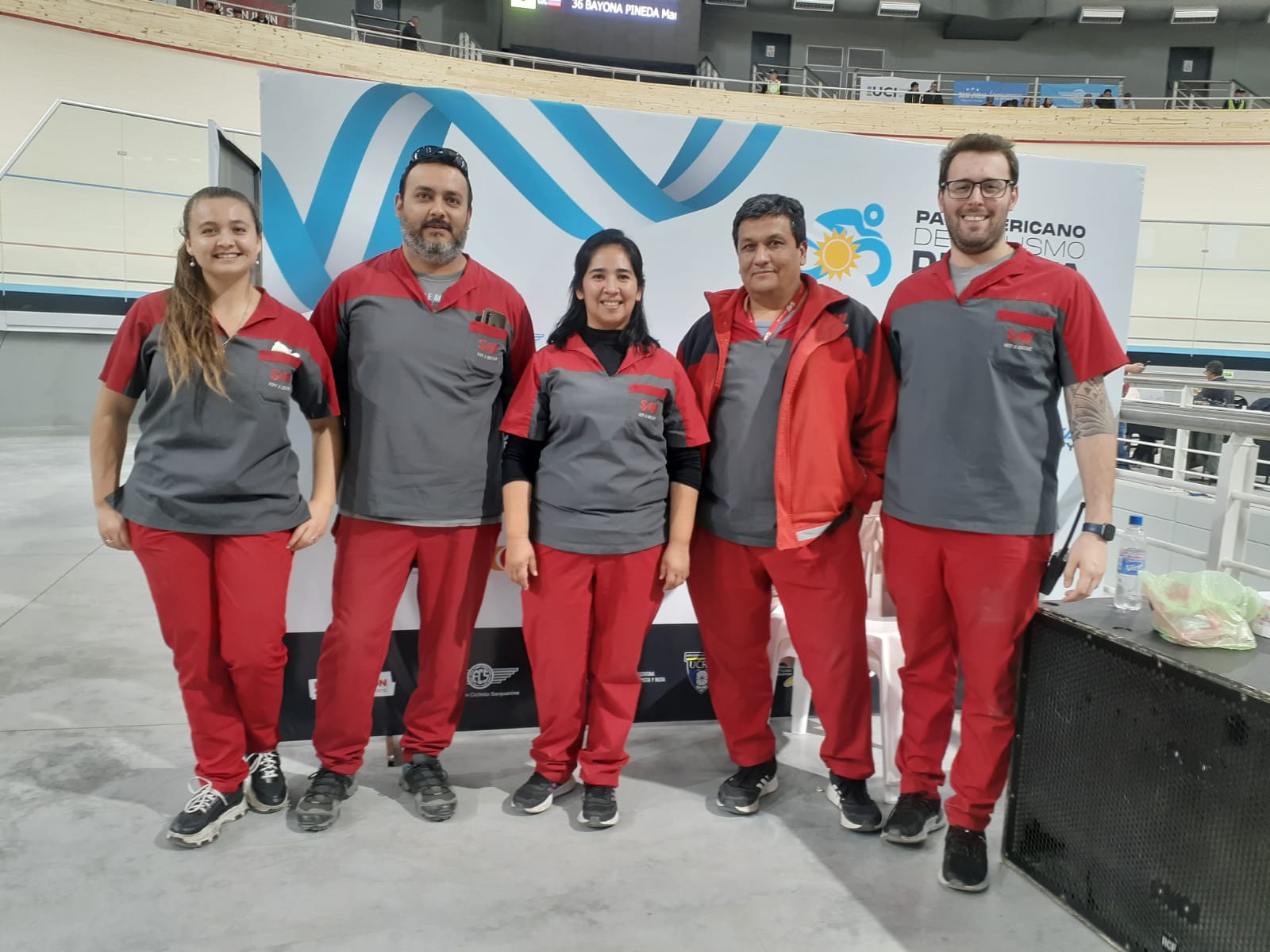 Sol Olivera, Carlos Cabrera, Analia Álamo, Roberto Astudillo y Octavio Pósleman, son quienes se encuentran trabajando en el velódromo de Pocito, equipados con tablas rígidas, collar cervical, equipos de traumas y descartables de emergencias, el equipo está listo para la acción.