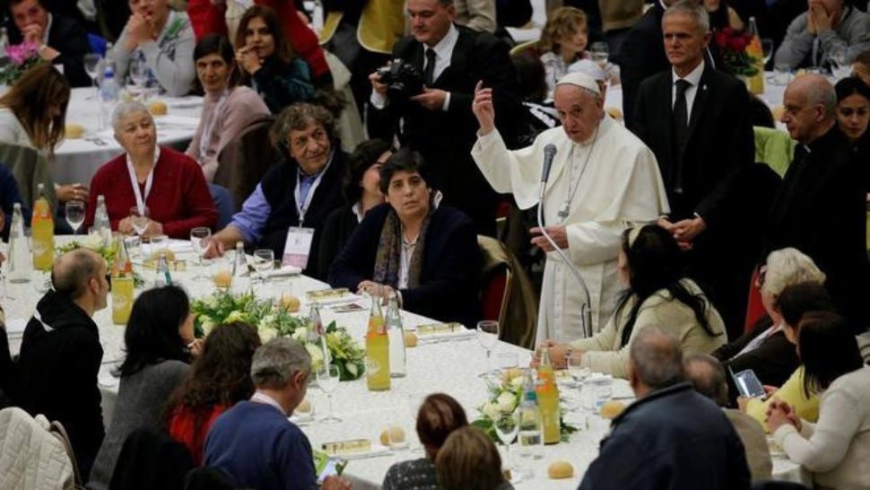 "Que Dios nos bendiga nuestras intenciones y nos ayude a salir adelante", pidió el pontífice antes de iniciar la comida. Luego, cada uno de los invitados se llevó de regalo una bolsa con varias pastas típicas italianas.