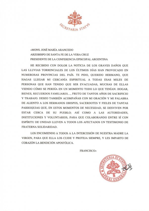 Francisco envió una carta dirigida al presidente de la Conferencia Epsicopal Argentina, monseñor José María Arancedo, para remarcar su "cercanía espiritual" y envió "bendiciones" para los damnificados por las inundaciones que afectan a varias provincias argentinas desde los últimos días.