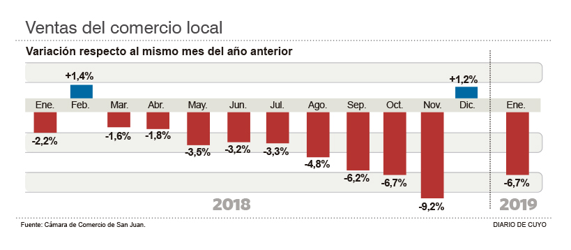 - 6,7 por ciento es lo que cayeron las ventas del comercio minorista sanjuanino el mes pasado, siempre contando en unidades.