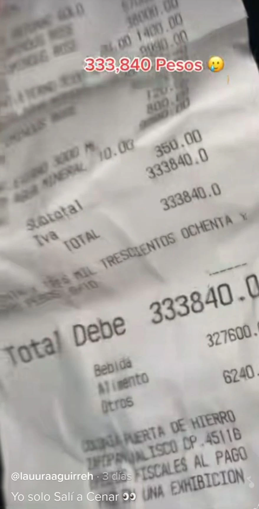 Finalmente, en el ticket expuesto en la publicación de TikTok el gasto alcanzó los 333.840 pesos mexicanos, que equivale a casi un millón setecientos mil pesos argentinos. Al momento de ver la elevada cifra el grupo empezó a discutir y empezaron a separar sus gastos. “Lo de Karen y lo mío es 14. ¿Y los 70 mil?”, se alcanza a escuchar en la filmación. Sin embargo, al terminar la noche, el grupo se puso de acuerdo y pagaron el total.