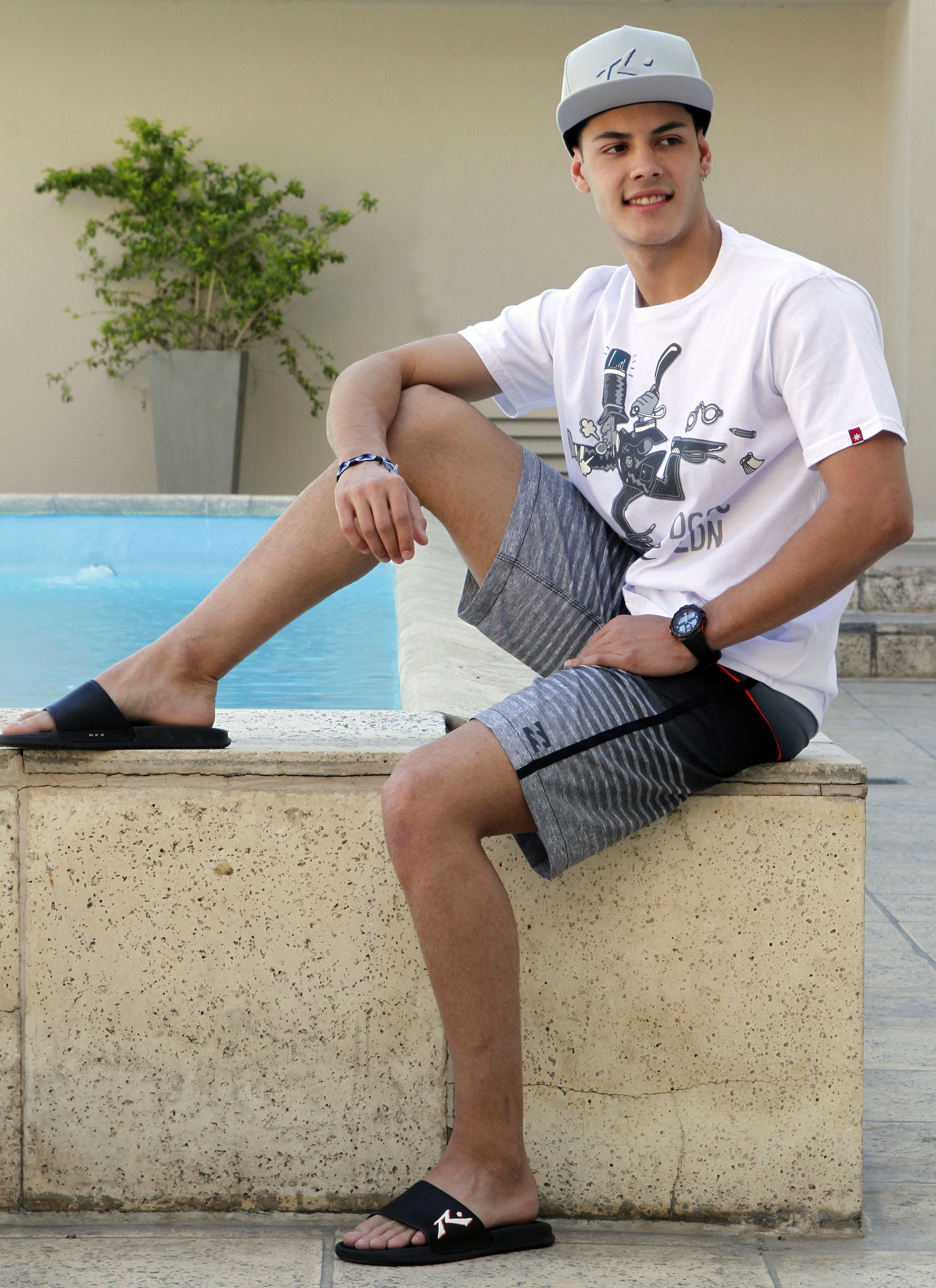 Musculosa tricolor ($490, Rusty), con una malla estampada ($950, Gotcha). Como accesorios una gorra con visera ($430, Rusty), unas ojotas de neoprene ($990, Quiksilver) y una mochila multipropósito ($1390, DC).