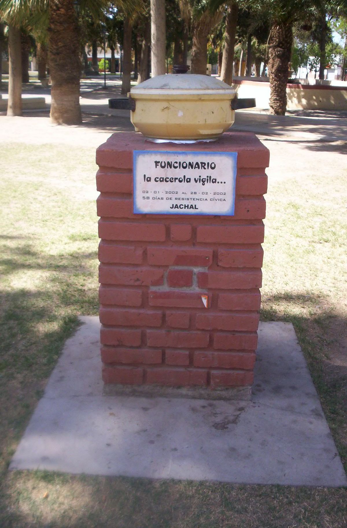 Esa jornada fue casi festiva. Unas 300 personas participaron con ollas, banderas argentinas, golpes de botellas de plástico, abucheos cuando los funcionarios salientes eran mencionado, canciones y hasta bailes. El monumento es una gran olla realizada con una campana de frenos de un camión Mercedes Benz. Su tapa con una bóveda de cemento y como perilla tiene un aislador de luz.
