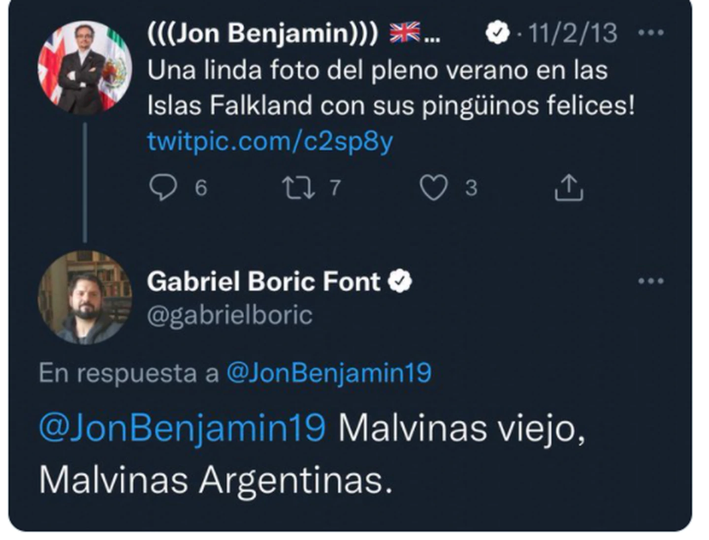 Entonces Boric le respondió de manera contundente: “Malvinas viejo, Malvinas Argentinas”.