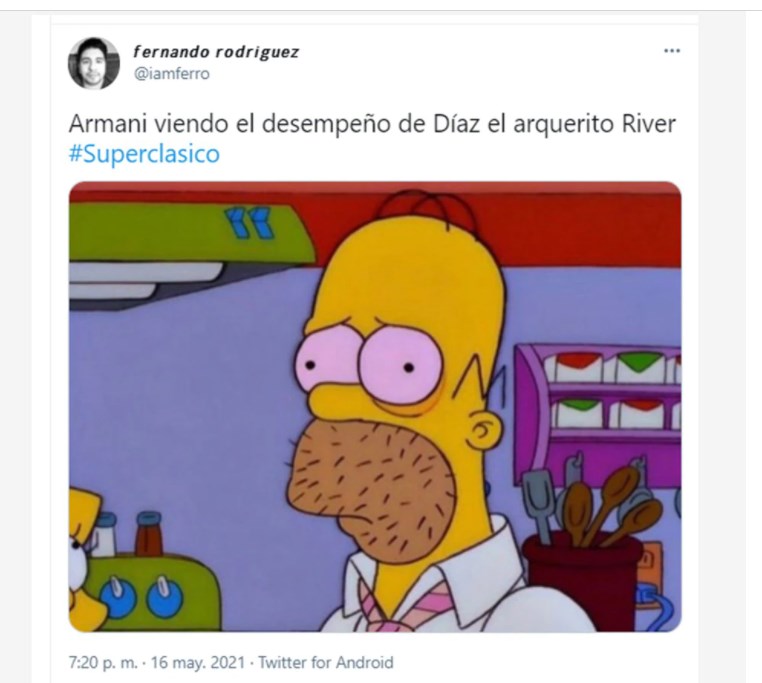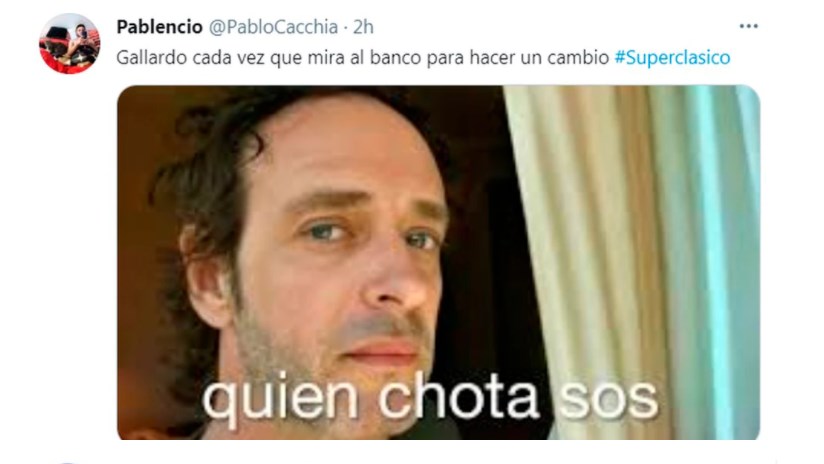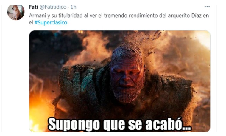 En un fútbol sin hinchas en las tribunas por la pandemia, los fanáticos se volcaron a las redes sociales para tomarse con humor lo sucedido. La caída de Marcelo Gallardo, quien nunca como entrenador había perdido un mano a mano ante su clásico rival, fue foco de varias burlas, pero también hubo memes dedicados al joven arquero Díaz y a Juan Román Riquelme.