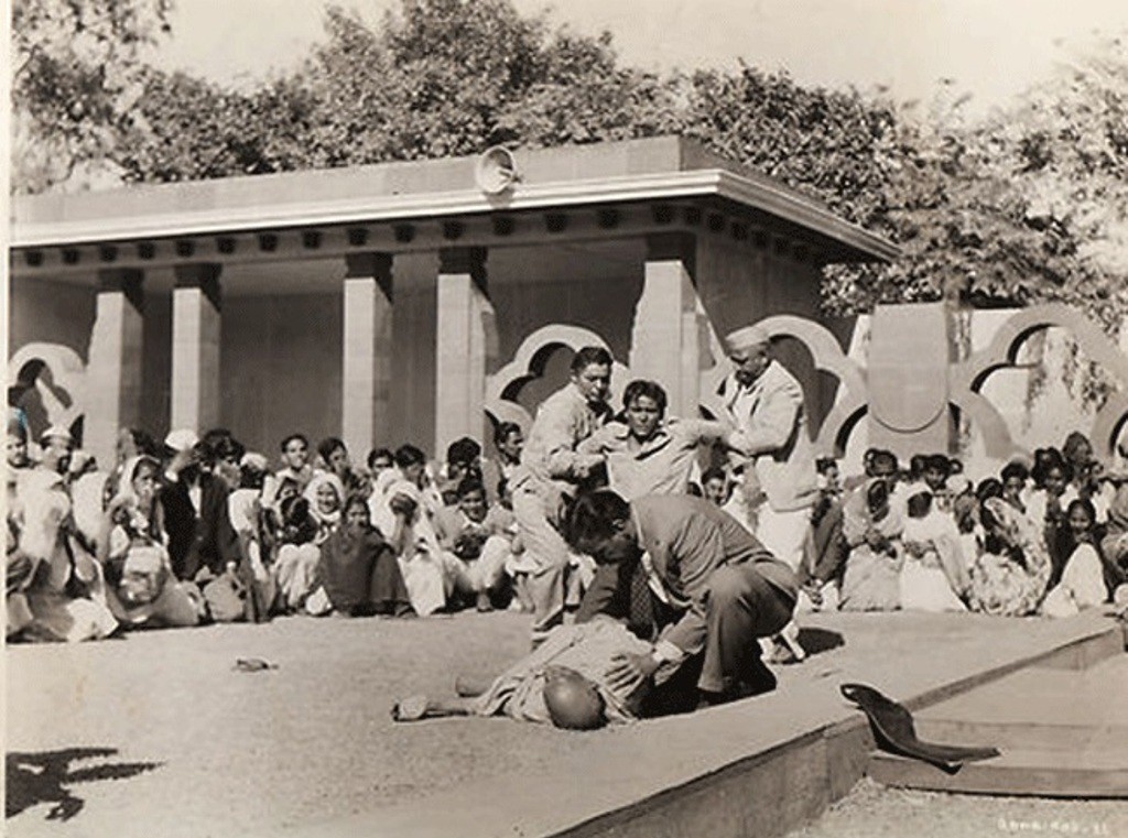 Preciso instante en que Gandhi cae muerto en el jardín del palacio Delhi, ante la multitud que esperaba su palabra.