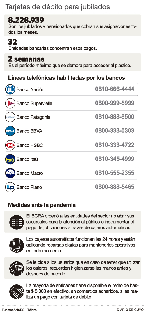 Las principales entidades bancarias encargadas del pago de jubilaciones han habilitado líneas telefónicas para que clientes que hayan extraviado su tarjeta de débito puedan gestionar un nuevo plástico y recibirlo a domicilio, ante la imposibilidad de cobrar en efectivo sus haberes por ventanilla mientras dura la cuarentena por coronavirus.