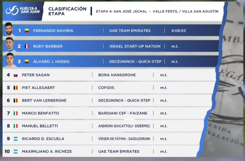 Tal como se esperaba, la cuarta etapa de la 38º edición de la Vuelta a San Juan se definió con un embalaje masivo y fue allí, en la plaza principal de Valle Fértil, donde brilló una vez más el colombiano Fernando Gaviria para quedarse con el parcial más extenso de la carrera.