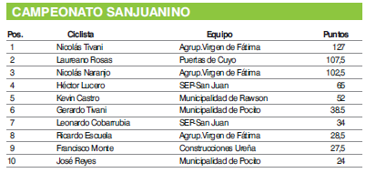 La cuarta etapa no trajo demasiadas variantes para los sanjuaninos. En la clasificación general donde manda Evenepoel, el local mejor ubicado es Juan Pablo Dotti (foto) del Sindicato de Empleados Públicos, ahora en el puesto 11º a 1m54s, que le abre la chance y le mantiene la ilusión intacta de poder descontar en El Colorado. Después, Magno Prado, también del SEP, se ubica en la posición 24º a 2m20s del líder. Detrás viene Puertas de Cuyo, con Daniel Díaz 25º a 2m21s, Leandro Messineo 28º a 2m22s y Laureano Rosas 30º a 2m27s. Gran jornada volvió a tener Daniel Juárez ciclista de la Agrupación Virgen de Fátima, sumando en las metas de montaña y manteniendose como líder en esa clasificación. En tanto que el jachallero José Reyes (Mun.de Pocito) seguirá luciendo la casaca de mejor sanjuanino gracias a su 38º puesto. Juan Melivillo (Mun.de Pocito), Nicolás Tivani (Virgen de Fátima) y Rubén Ramos (Mun.de Pocito) se ubican 39, 40 y 41.