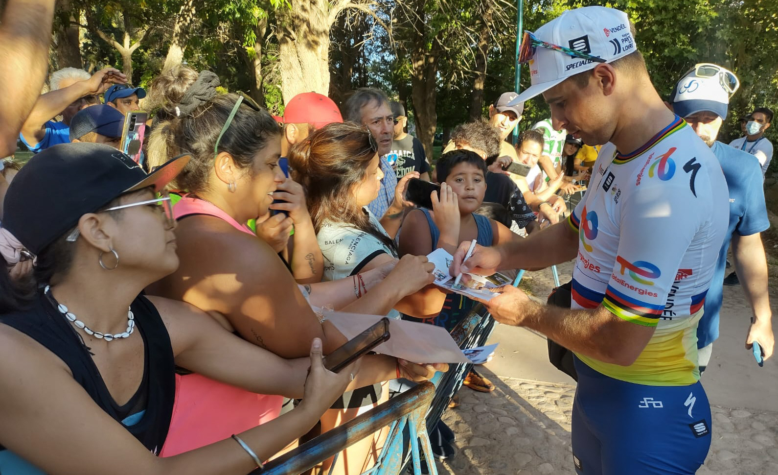 El colombiano Fernando Gaviria (Movistar) venció en un mano a mano furioso al eslovaco Peter Sagan (TotalEnergies) y se quedó ayer con la cuarta etapa de la Vuelta a San Juan, que culminó en Barreal. Con este triunfo, el noveno con tres camisetas distintas (Deceuninck-Quick Step, UAE Emirates Team, y ahora la de los telefónicos españoles), el velocista que irrumpió venciendo en dos ocasiones a Mark Cavendish, en el Tour de San Luis 2015, y fue contratado por el equipo belga, es quien más veces ha mostrado, en primer plano -puesto- la publicidad de su pecho a las cámaras de fotos y video, desde que la, ahora, única carrera por etapas que tiene el continente americano dentro de los más altos niveles de la UCI iniciara su idilio con el profesionalismo en 2017.