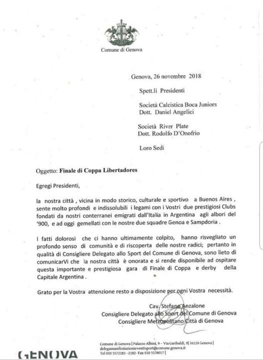 El secretario de Deportes de esa comuna, Stefano Anzalone, envió una carta a los clubes protagonistas para ofrecer el estadio "Luigi Ferraris" para la segunda final de la Copa Libertadores.