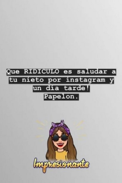 Gianinna no se lo dejó pasar y le dedicó mensajes en Instagram Stories: “¡Qué ridículo es saludar a tu nieto por Instagram y un día tarde!”. En otro mensaje aseguró: “Bueno… Es lo que hay”.