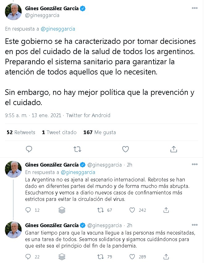 "Ganar tiempo para que la vacuna llegue a las personas más necesitadas es una tarea de todos. Seamos solidarios y sigamos cuidándonos para que este sea el principio del fin de la pandemia", reiteró González García, luego de recordar -siempre a través de su cuenta en Twitter- que "la Argentina no es ajena al escenario internacional, (donde) rebrotes se han dado en diferentes partes del mundo y de forma mucho más abrupta, (y) escuchamos y vemos a diario nuevos casos de confinamientos más estrictos para evitar la circulación del virus".