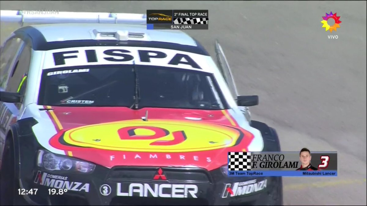 El piloto del 3M Mitsubishi Racing, Franco Girolami, tuvo una victoria importante en función del campeonato, ya que consiguió el triunfo en la segunda final del domingo para el Top Race en la provincia, ya que quedó a 10 puntos del líder Agustín Canapino.