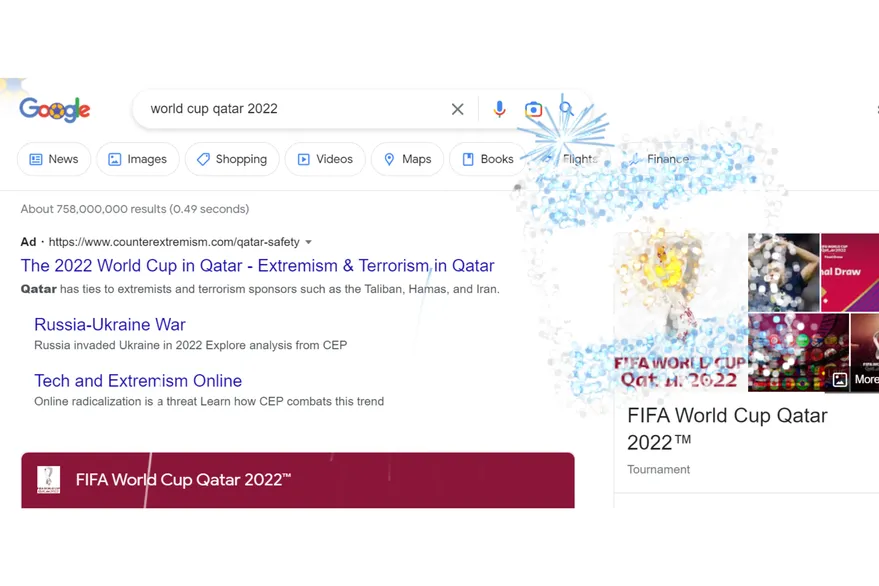 Además, una vez que el usuario hace click en la imagen, se abre la página del buscador con las palabras “World Cup Qatar 2022″ (Copa del Mundo Qatar 2022, en especial) y Google emprende una búsqueda sobre el acontecimiento y comparte toda la información disponible. Asimismo, aparecen varias animaciones que imitan fuegos artificiales de los colores celeste y blanco que terminan conformando una bandera argentina.